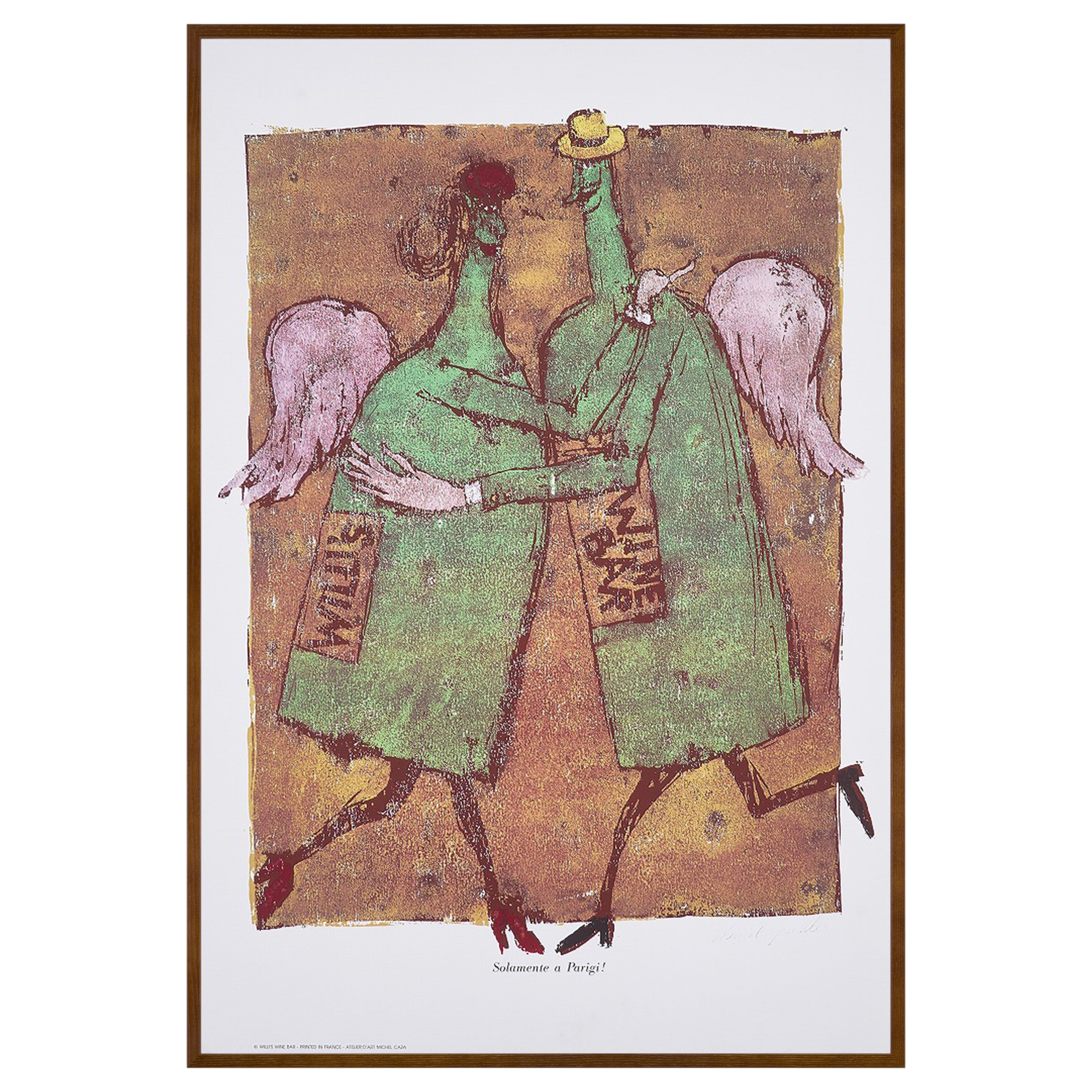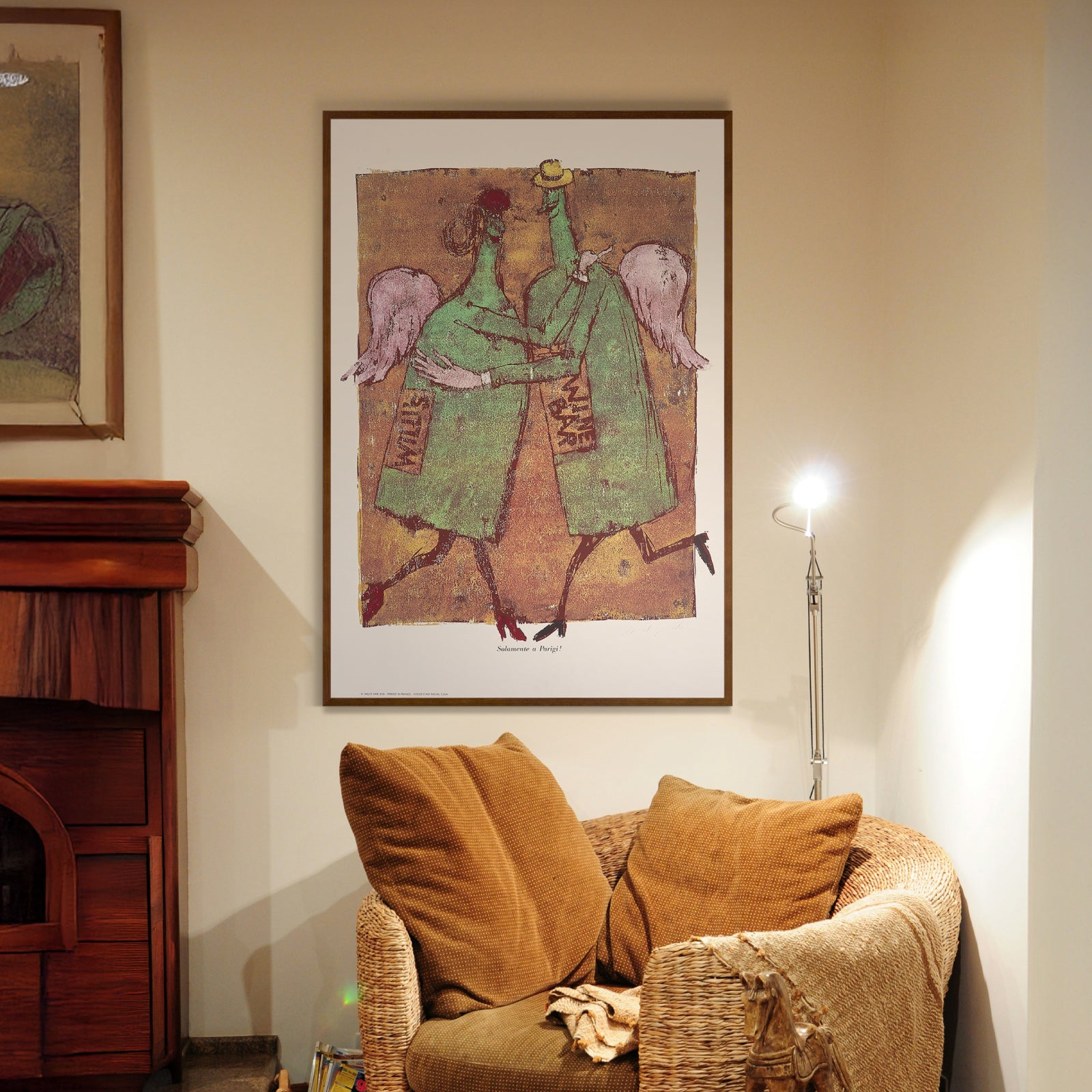 2本のワインボトルが抱き合うデザインで、パドルズらしい木版画のような風合いをリトグラフで表現した、非常に魅力的なポスター。ワイン好きやフランスのカフェ好きな方にもオススメしたい作品です。