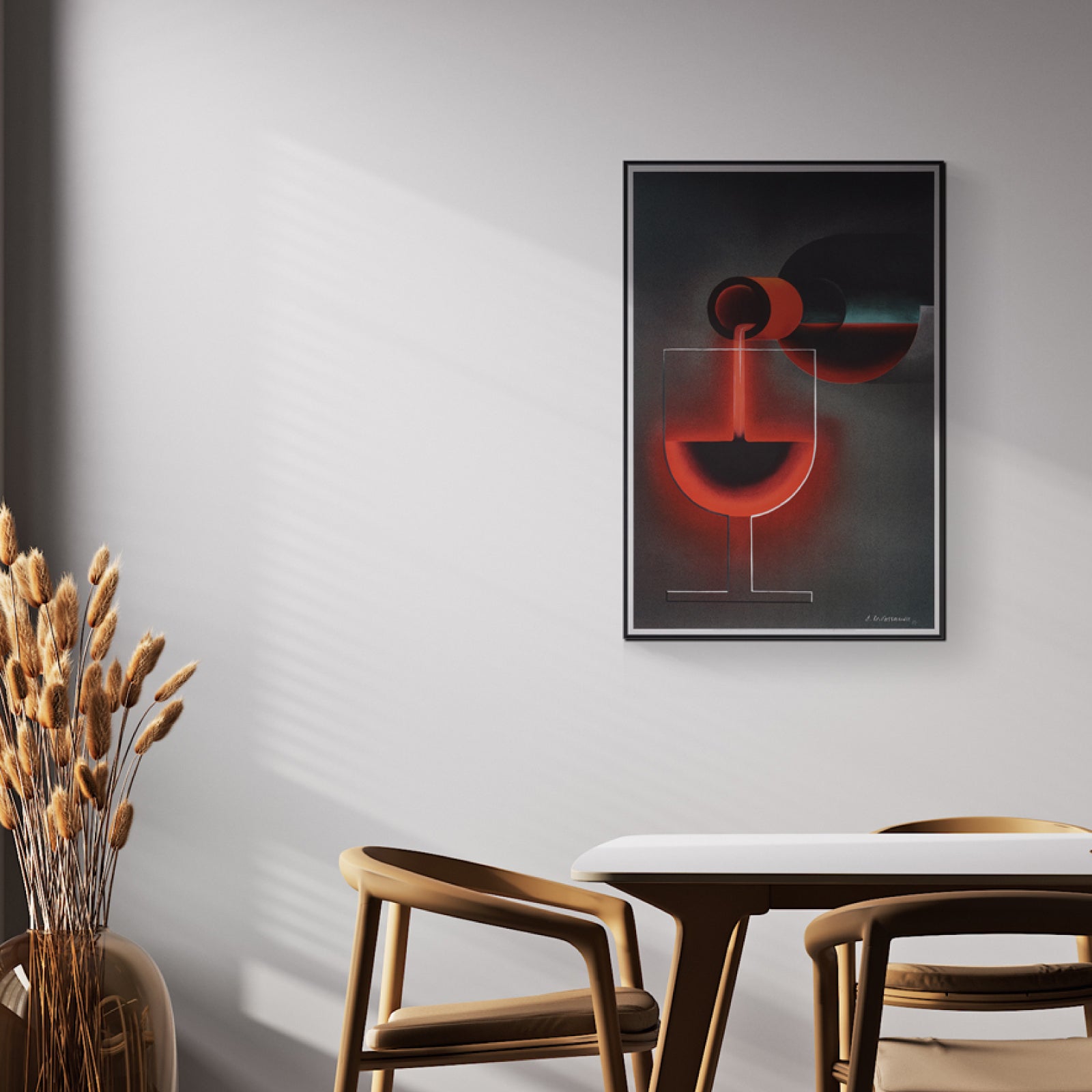 リトグラフによって赤ワインの美しい色彩を風合い豊かに表現している1枚ですので、インテリアに合う合わないというより、赤ワインがお好きな方に飾っていただきたい作品です。