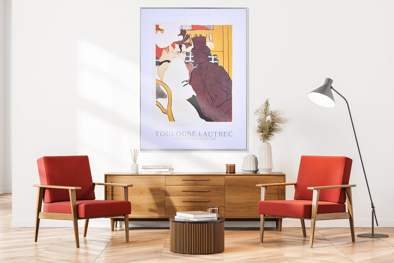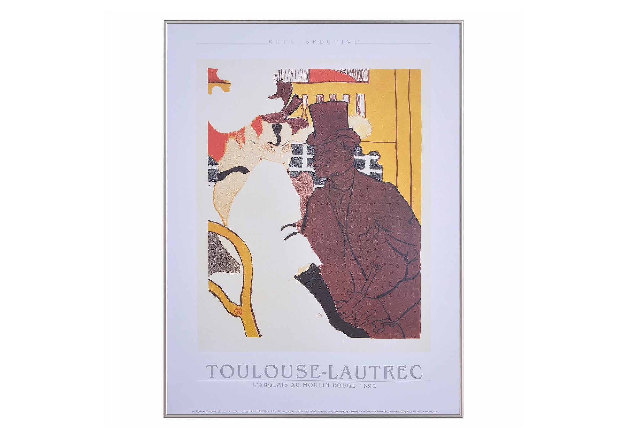 フランスの画家、トゥールーズ=ロートレックが1892年に製作したリトグラフ作品『L'ANGLAIS AU MOULIN ROUGE(ムーラン・ルージュのイギリス人)』を、1991年にポスターにしたものです。余白が効いたポスターで、下部に配されたトゥールーズ=ロートレックのテキストも薄いグレーでデザインされている点にもこだわりが感じられます。