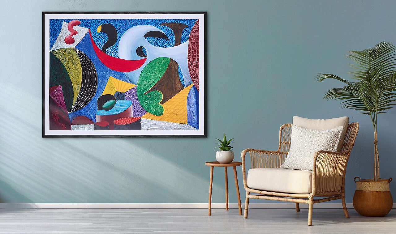 レッドやイエローが使われていれば大抵のインテリアには飾りやすいのですが、作品内で使っているブルーをもっと活かして空間演出したい場合は、壁の色を最近人気のブルーやグレー系にするといいでしょう。そうすると洒落た空気感がさらに引き立ちますよ!
