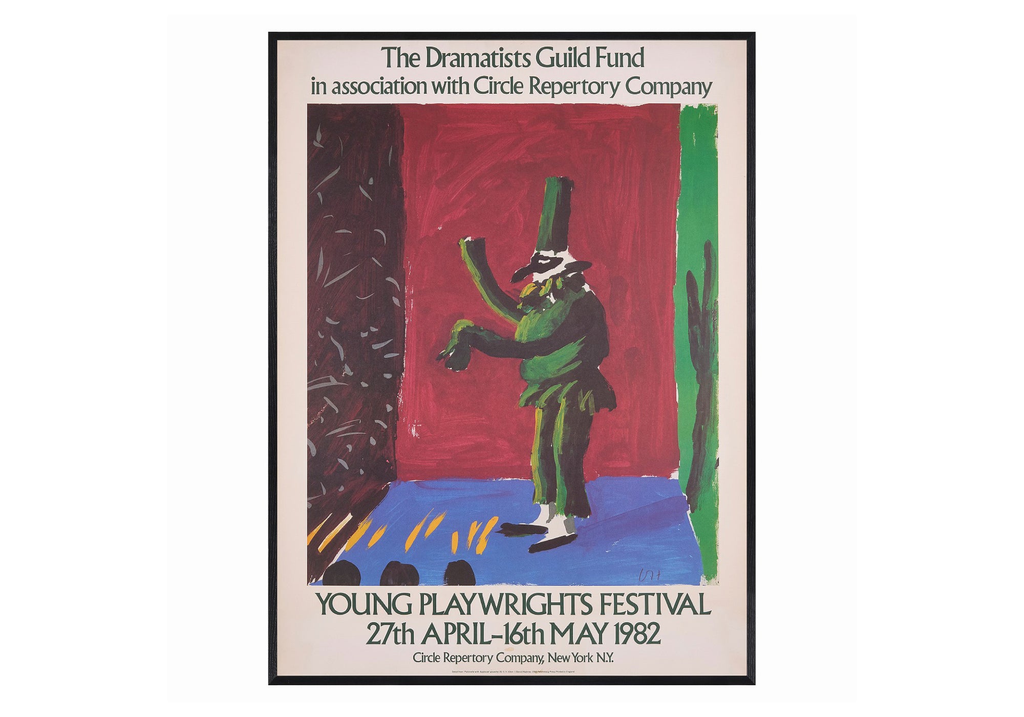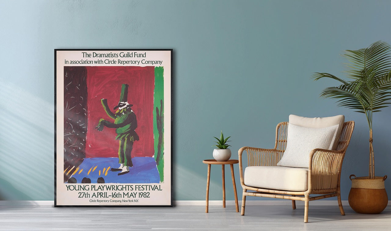 こちらもデイヴィッド・ホックニーの作品を使ったポスターです。1982年に開催された『若手劇作家フェスティバル』のものです。上下に施されたテキストの書体もクラシックで、かつ全体のデザインとしても非常に効いています。これぞアートポスターの醍醐味といえるでしょう。