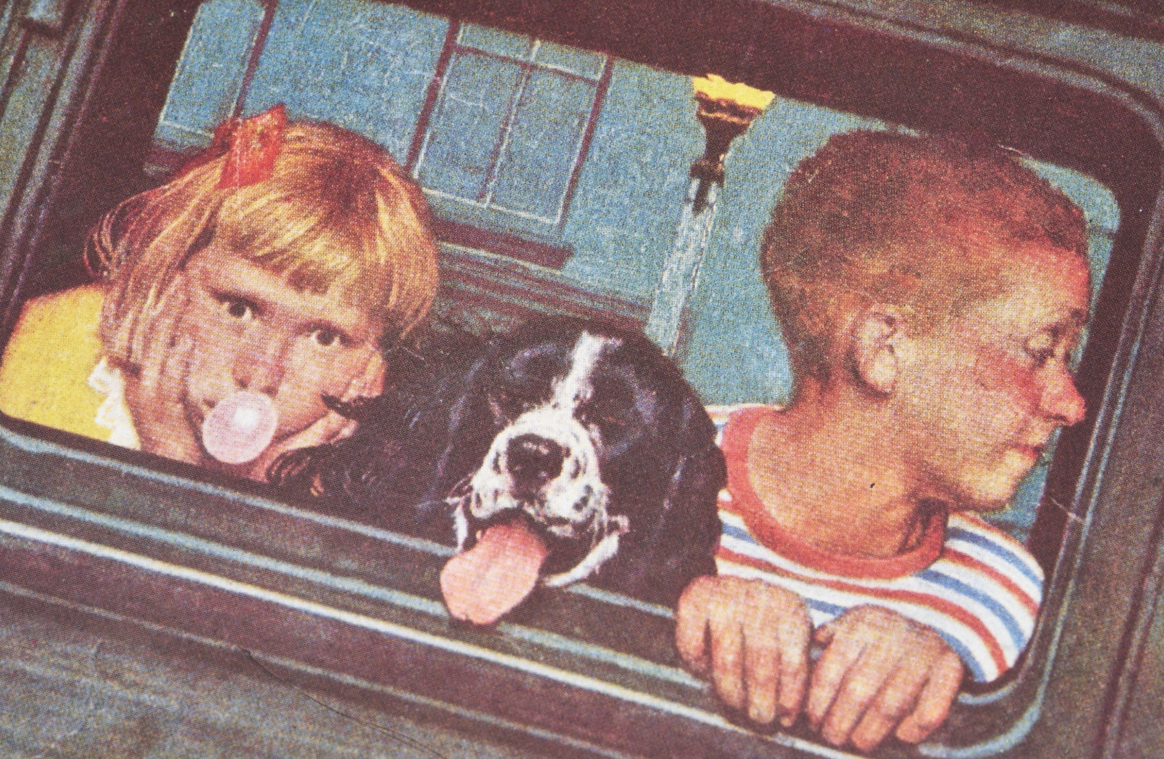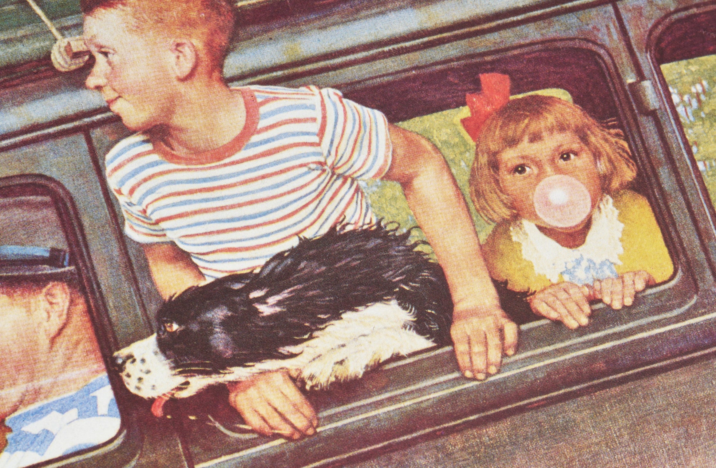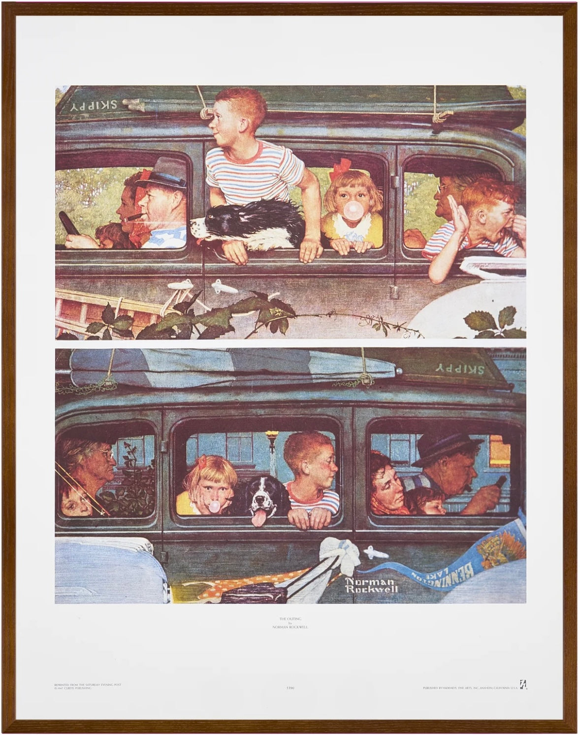 上半分が往路。みんながワクワクしていて車内もすごく明るい様子です。そして下半分が復路。子供達はまだ帰りたくなさそうですが、運転するお父さんには疲れが見え、助手席のお母さんはすでに寝てしまっています。家族でお出かけした際の往復の車内は、現在でもこれと変わりません。時代や国に関係なく、誰もが共感できてクスッと笑ってしまうようなユーモア溢れるストーリーの描写が、世界中でロックウェルが愛され続ける大きな理由のひとつなのです。