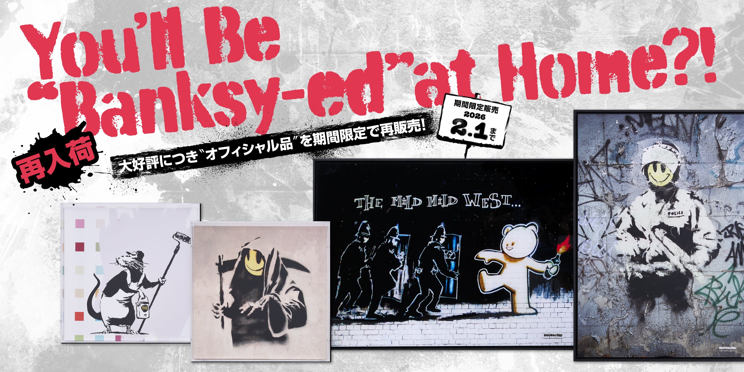 そんなバンクシーのオフィシャル作品をPOP ART BANANASで期間限定で販売する。前述の『Stream of Banksy Effect ストリートアートの進化と革命 展 - Street Art (R)Evolution -』の会場限定で受注販売されたもので、同展のために正規の版権を取得して製作した希少なアートだ。これらは、バンクシーのグラフィティアートを合法的に商品化するプロジェクト行うイギリスのFull Colour Black社によるグラフィティアートプロジェクト「BRANDALISED」と契約しており、一点一点証紙を貼ってお届けする。バンクシーのオフィシャルのアートをここまでラインナップできる機会は滅多にない。しかもすべて他では味わえない特別な額装品となっているため、ぜひこの機会をお見逃しなく。