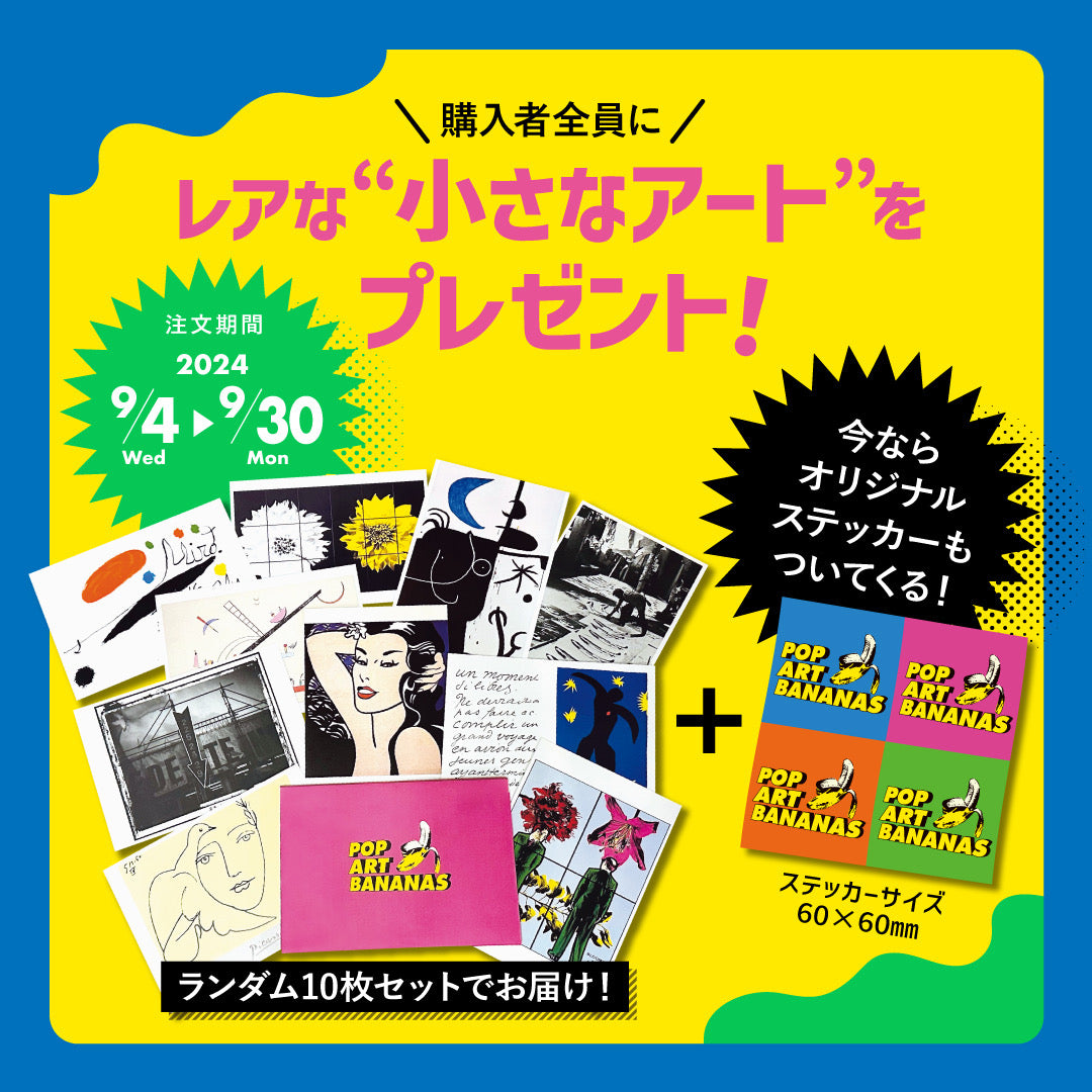 何が入っているかはお楽しみ!POP ART BANANASでお買い物をいただいた方全員に、レアなアート作品10種類のポストカードと、POP ART BANANSオリジナルステッカーをプレゼントいたします。